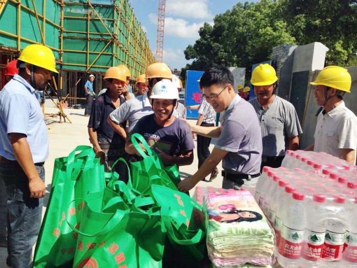 時(shí)值酷暑,近日寧波市總工會副主席魯煥清等一行來到東錢湖萬金人家安置小區(qū)項(xiàng)目部,給高溫中辛勤工作的務(wù)工人員送去西瓜、毛巾、藿香正氣水等防暑用品。詢問了解務(wù)工人員工作狀況,叮囑他們勞逸結(jié)合,提高安全意識。
